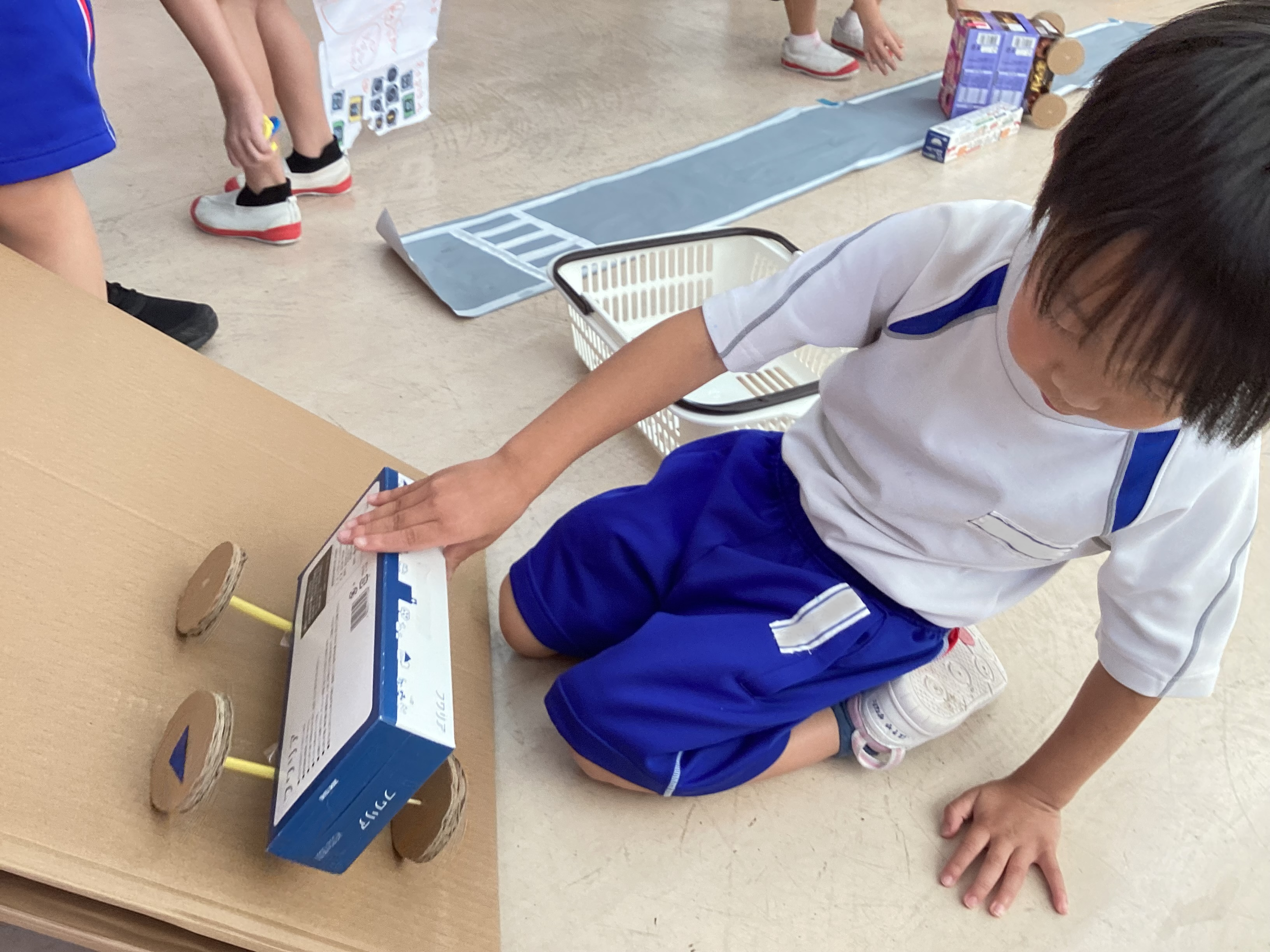 「動くおもちゃを作って遊ぼう!」では、たくさんある空き箱の中から好きな物を選び、箱の向きや組み合わせ方を真剣に考えながらオリジナルの車を完成させました。遊ぶ時間には、紙で作った道路の上を走らせたり、坂道の上から勢いよく走る様子を眺めたりして時間いっぱい楽しみました。 |