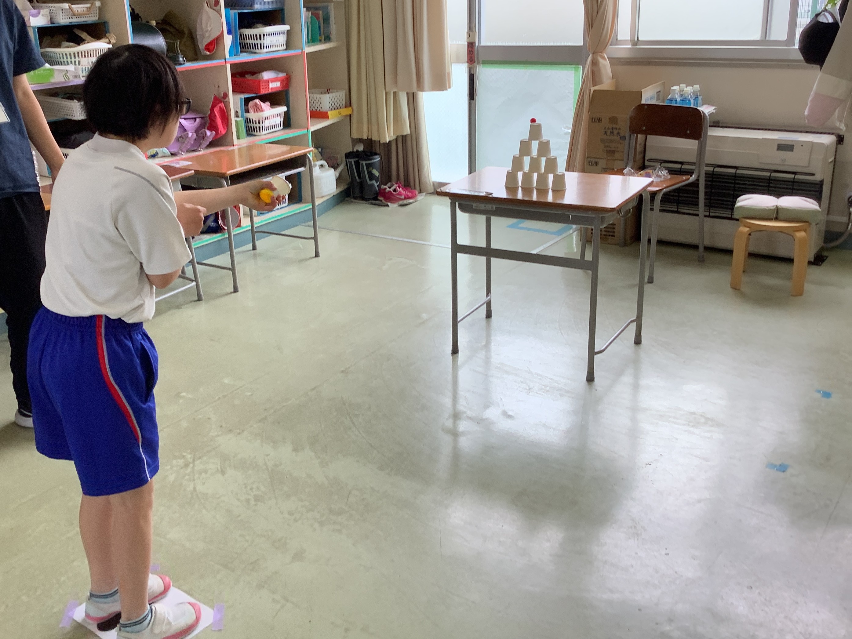「紙コップでポンッ!」では、自分たちで作った紙コップ鉄砲を使って、的当てをしました。初めは、的から外れてしまうことがありましたが、自分で打ち方を工夫したり、友達と相談したりしながら取り組むことで、的に当たるようになりました。遊びの時間では、友達と協力しながら活動することも大切にしながら取り組んでいます。 |