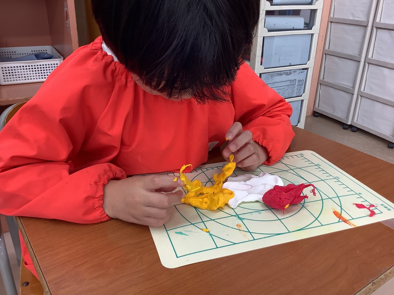 粘土を使った造形遊び。感触や形の変化を楽しみながら、こねる・丸める・ちぎる・のばすなど様々な動作を繰り返しながら、手先をたくさん使っています。触っているうちにできた形を見て、「これはヘビみたいだね。」「丸い形はボールみたい。」とどんどん作りたい物のイメージが膨らんでいきます。