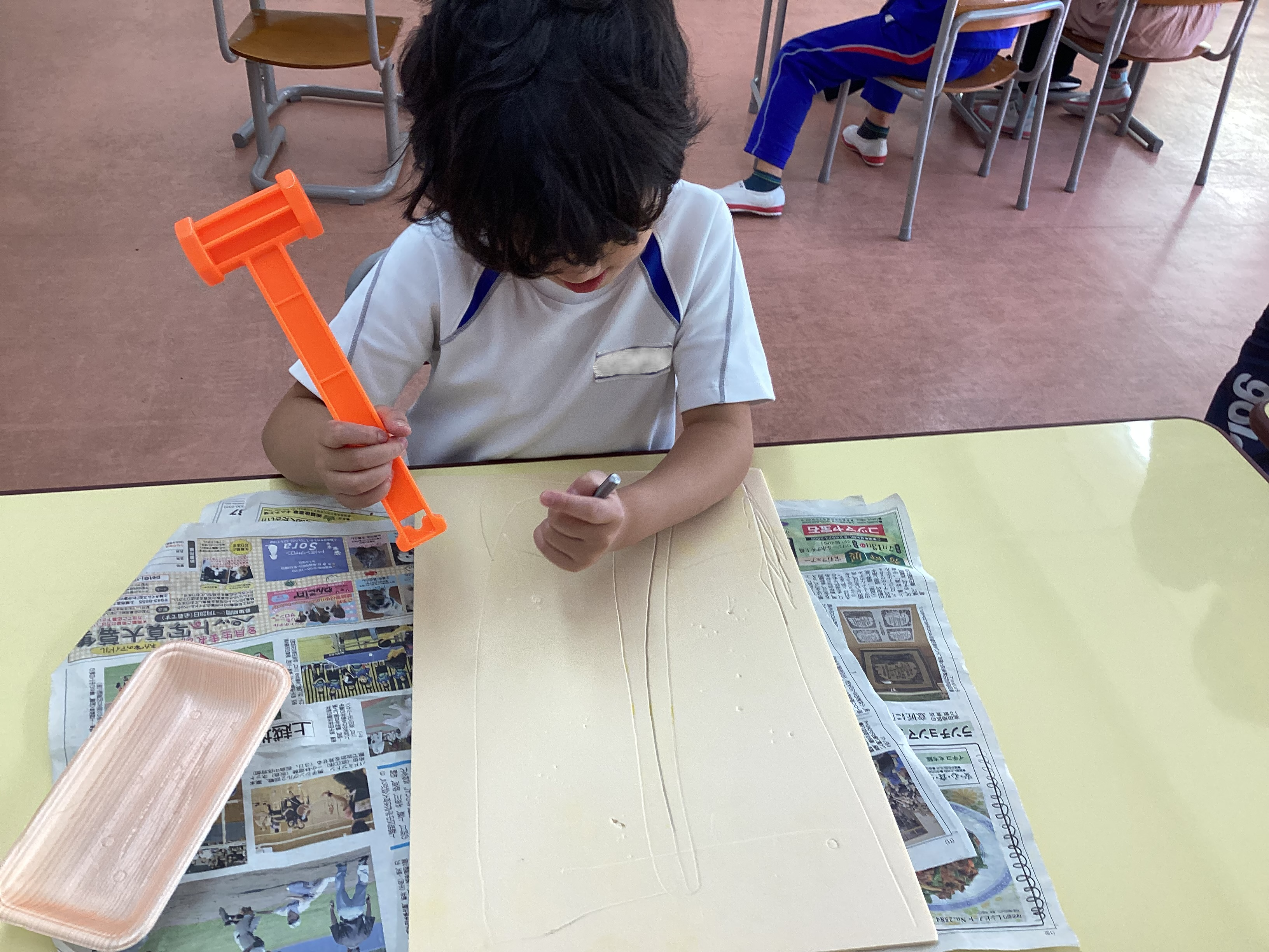 | 「トントン、カリカリ、色をかさねると…?」では、多色刷り版画に挑戦しました。鉛筆やペンなど身近な道具を使ったり、穴開け用のポンチという器具をハンマーで叩いたりして製版しました。自分の好きな物を思い浮かべて形を点や線で表現したり、道具の特徴や感触を楽しみながら版に模様をつけたりし、黄、赤、青、緑、白と毎時間色が重なる変化を感じながらじっくりと作品を完成させました。
