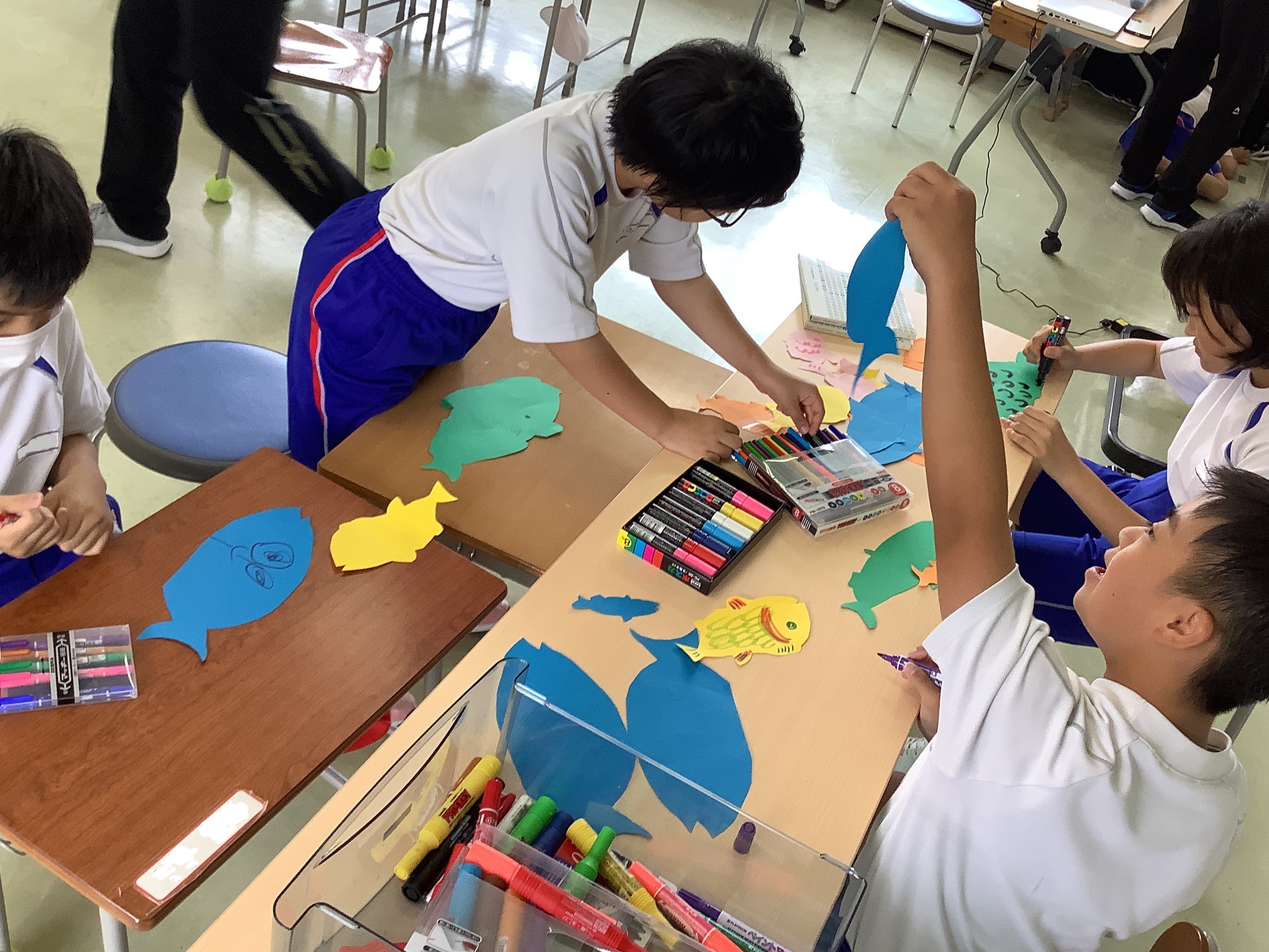 図工では、季節に合わせた飾りを作ったり体験したことを絵に表現したりしています。「染め物をしよう」では、輪ゴムやクリップを使ってビー玉を布でくるみ、オリジナルの模様を作って染めました。子どもたちはバケツをのぞき込み、布が染まっていく様子をじっくりと眺めていました。